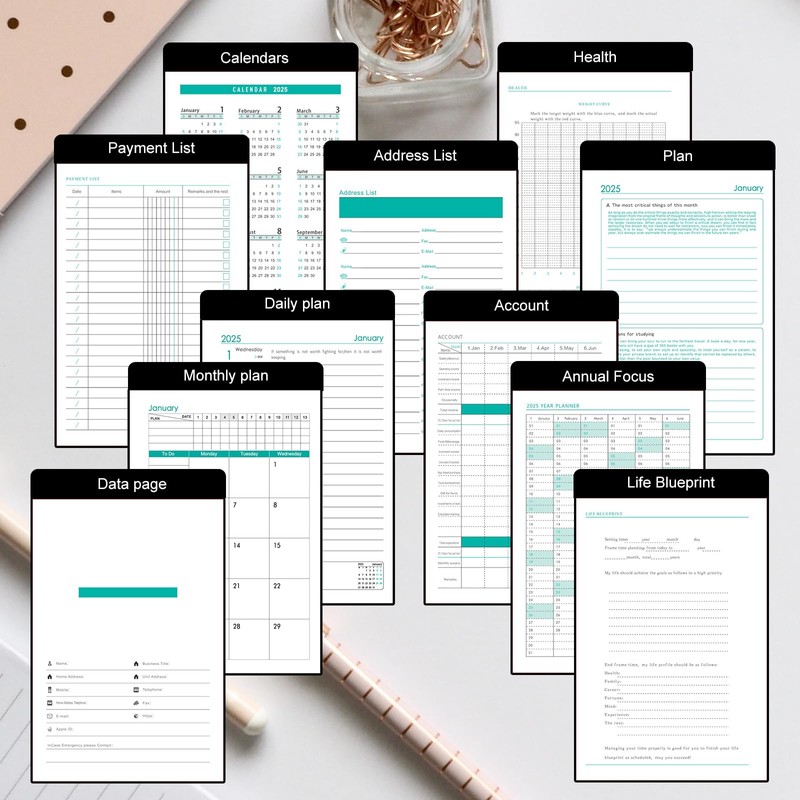 - Practical 2025 Planner:The planner features a well-designed layout.It contain Monthly Planner, 2025 Yearly Planner,calendar 2025 2026,Diary features full monthly view pages for each month. eparate pages with full Daily view for more detailed planning. and Contain other feature pages,as Personal Data,Health Page, Account Page,Payment List,Address List ,Graph Grid Paper Page.which makes your plan easily,The agenda will help you create a vision for your life, Acgieve your short and long-term goals.