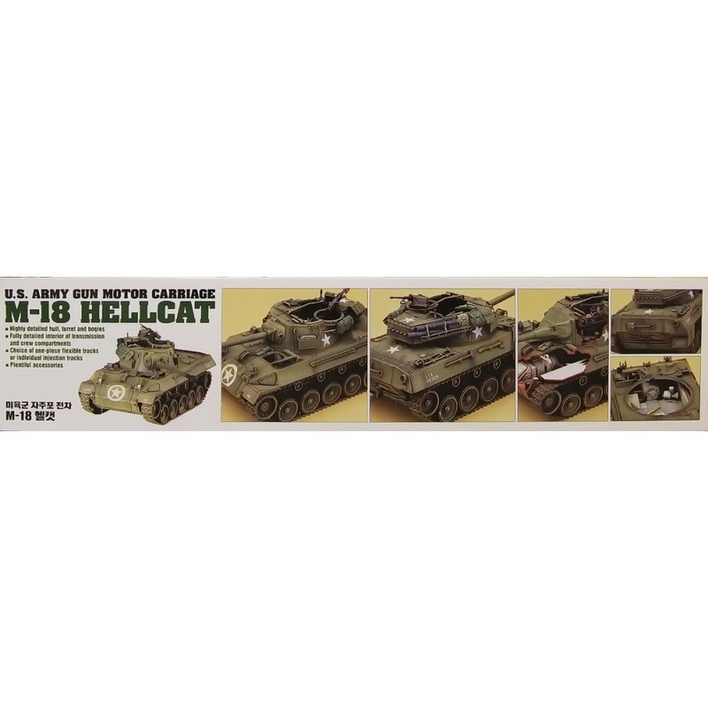 This is a 1/35 scale Academy plastic model kit. The 76 mm Gun Motor Carriage (GMC) M18 was an American tank destroyer of World War II. The manufacturer, Buick, gave it the nickname "Hellcat" and it was the fastest tracked armored fighting vehicle during the war with a top speed up to 60 mph. This kit includes a fully detailed interior of transmission and crew compartments as well as various accessories such as rucksacks and weapons. Decals are included to further enhance the accuracy and realism of this kit.