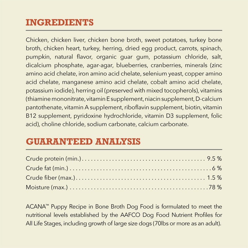 - ACANA wet dog food for puppies includes savory bone broth to add flavor and nutrition