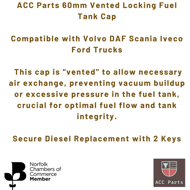 Enhance the security and functionality of your commercial vehicle with the ACC Parts 60mm Vented Locking Fuel Tank Cap. Engineered as a high-quality, direct replacement, this cap provides superior protection against fuel theft and ensures optimal tank ventilation for a wide range of popular truck makes.