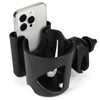 - This walker cup holder could be used for wheelchair, walker, rollator, armrest, mobility scooter, bike, stroller, trolleys, pushchair, lawnmowers etc. And it designed with a phone holder, can hold your cell phone and bottle steadily at the same time.