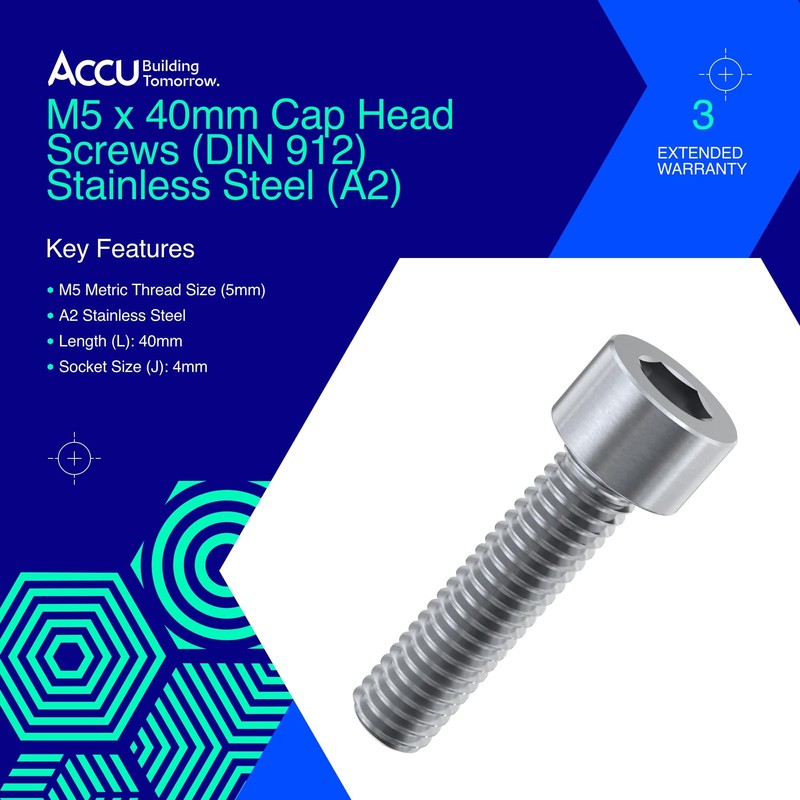 Accu - M5 x 40mm Cap Head Screws (DIN 912) - Stainless Steel (A2) (Pack of 20)