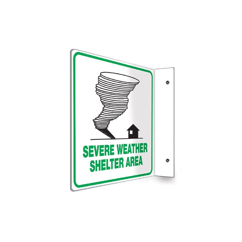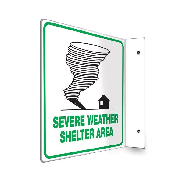 Accuform PSP252 Projection Sign 90D, "Severe Weather SHELTER Area", 8" x 8" Panel, 0.10" Thick High-Impact Plastic, Pre-Drilled Mounting Holes, Green/Black on White
