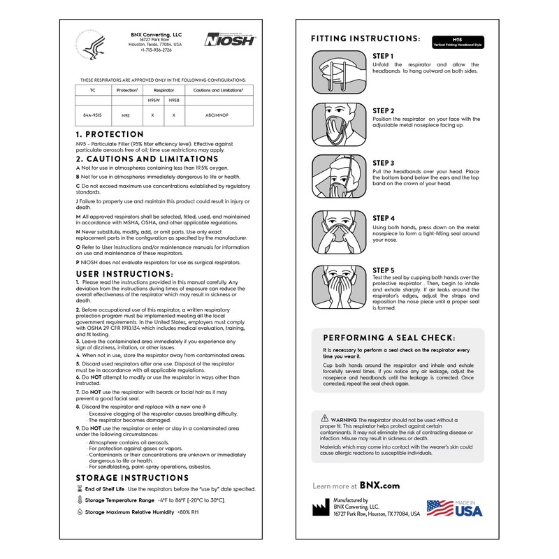 - MADE IN USA* – Manufactured by BNX Converting LLC in Houston TX, a and Registered (Registration # 3017489417) manufacturer of N95 mask respirators. *Manufactured in the USA from globally sourced components.