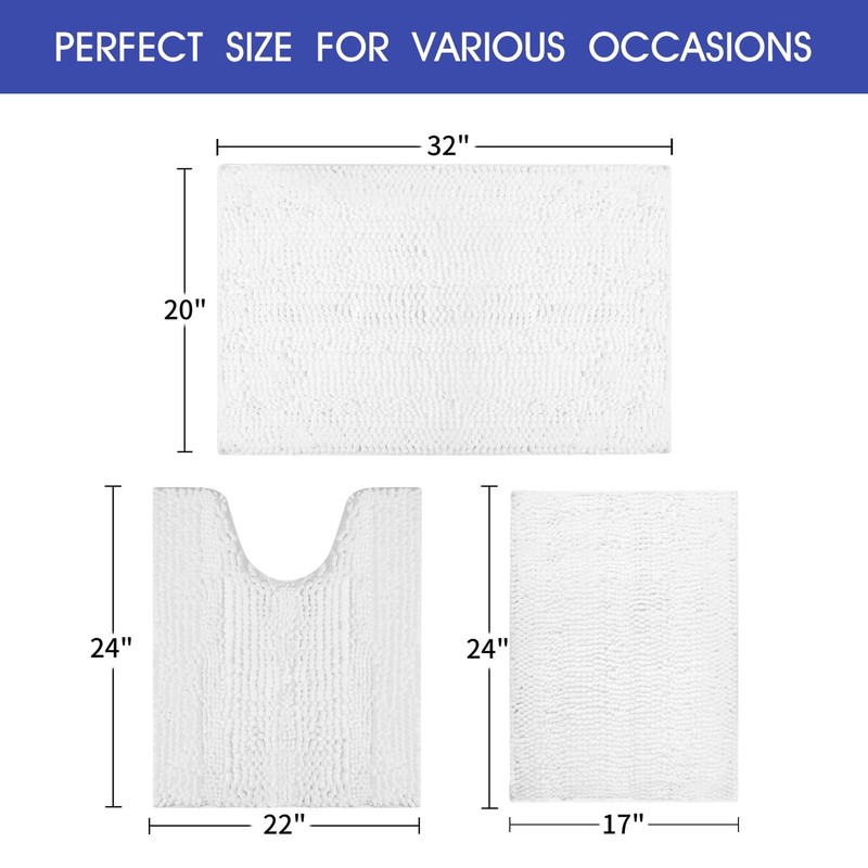 - LUXURY 3 PIECE BATHROOM RUG: Including 1 Large Bath Rug 20"x32", 1 U-Shape Contoured Rug 22"x24", 1 Small Bath Rug 17"x24". IM HOME bathroom rug set made of 100% luxurious chenille fabric microfiber with higher pile than others. The thick and soft chenille helps soothe tired feet and keep your toes warm on the cold floor. The high density and plushness of the chenille offers exceptional comfort and support for your feet. You will feel like stepping on a cozy cloud to enjoy the ultimate luxury.