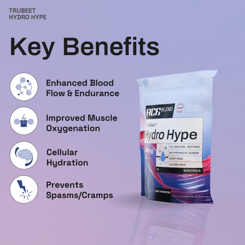- Endurance & Hydration: TruBeet Hydro Hype leverages nitrate-based energy from beetroot helps to enhance blood flow, boost oxygen delivery to muscles, improve endurance, and support hydration.Continued use promotes better athletic performance, faster recovery, and strengthens overall immunity..