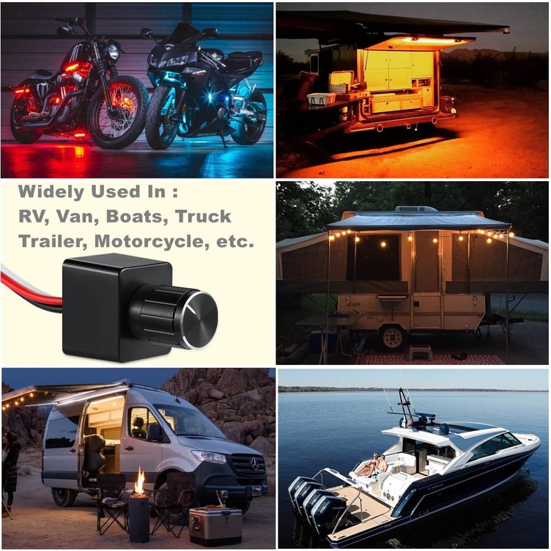 - Commonly used for lights in RVs, camper trailers, boats, cars, marine, trucks, vans or any dimmable DC 12V LED lights, strip lights, awning lights, etc.