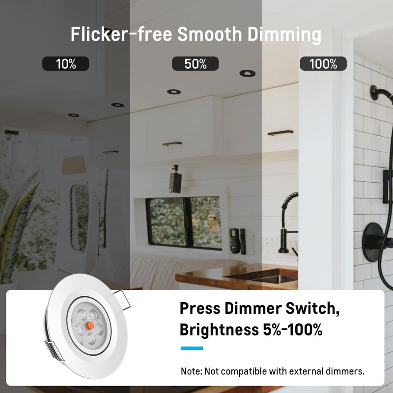 - 【Premium Construction】Crafted from solid aluminum, these RV Interior light exhibit increased durability and superior heat dissipation. Their crystal-cut lenses ensure uniform light projection, exuding an elegant look even when switched off. Boasting a high Color Rendering Index (CRI) of 90+, these LEDs light faithfully render objects in their natural, true colors.