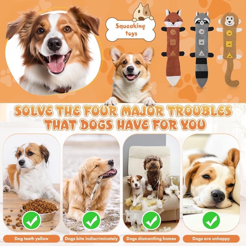 - 【Cute Pattern】Three cute shapes are available: raccoon, fox and monkey, with bright colors to suit your dog's visual preferences. Your dog can move the unstuffed toy freely, and the lightweight design makes it easy for your dog to pick up and carry. It can be played indoors and outdoors, making it one of their favorite toys!