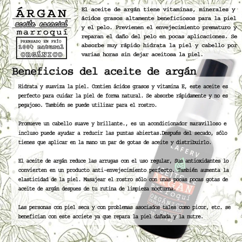 Extraído cuidadosamente de los frutos del árbol de Argán, este aceite es un tesoro de la naturaleza, rico en Vitamina E, antioxidantes y ácidos grasos esenciales (Omega 6 y 9). Su proceso de doble prensado en frío garantiza que cada gota conserve intactas todas sus propiedades regeneradoras y nutritivas, ofreciendo una hidratación intensa y duradera para tu piel, un brillo y fortaleza sin igual para tu cabello, y una resistencia sorprendente para tus uñas. Combate eficazmente los signos del envejecimiento al reducir líneas finas y arrugas, mejora la elasticidad de la piel, calma irritaciones y protege contra los radicales libres. Su textura ligera se absorbe rápidamente sin dejar residuos grasos, haciendo de este aceite un indispensable en tu rutina de belleza diaria. ¡Con el Aceite de Argán Puro y Orgánico, descubre una piel radiante, un cabello sedoso y unas uñas fuertes, todo con un solo producto!