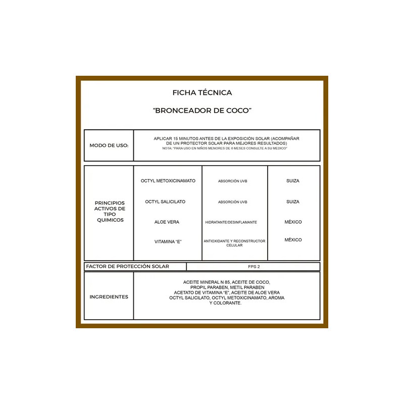 Aceite Bronceador de Coco FPS 2: Ideal para quienes buscan un bronceado suave y natural. Su fórmula ligera te ayuda a broncearte mientras nutre tu piel con la deliciosa fragancia del coco.