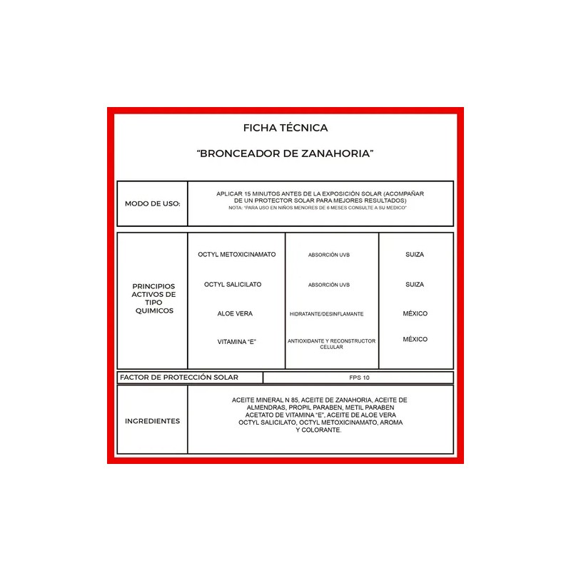 Bronceador de Zanahoria FPS 10: Ofrece una mayor protección y un bronceado más intenso, gracias a sus propiedades nutritivas. Ideal para quienes desean un tono dorado más marcado.