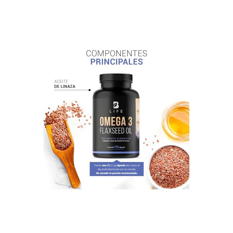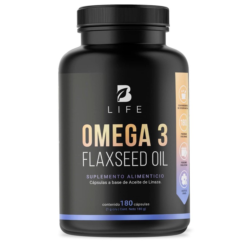 Aceite de Linaza Puro Omega 3 180 Cápsulas. Ingredientes naturales: Ácido Alfa Linolénico. Omega 3 Flaxseed Oil B Life.