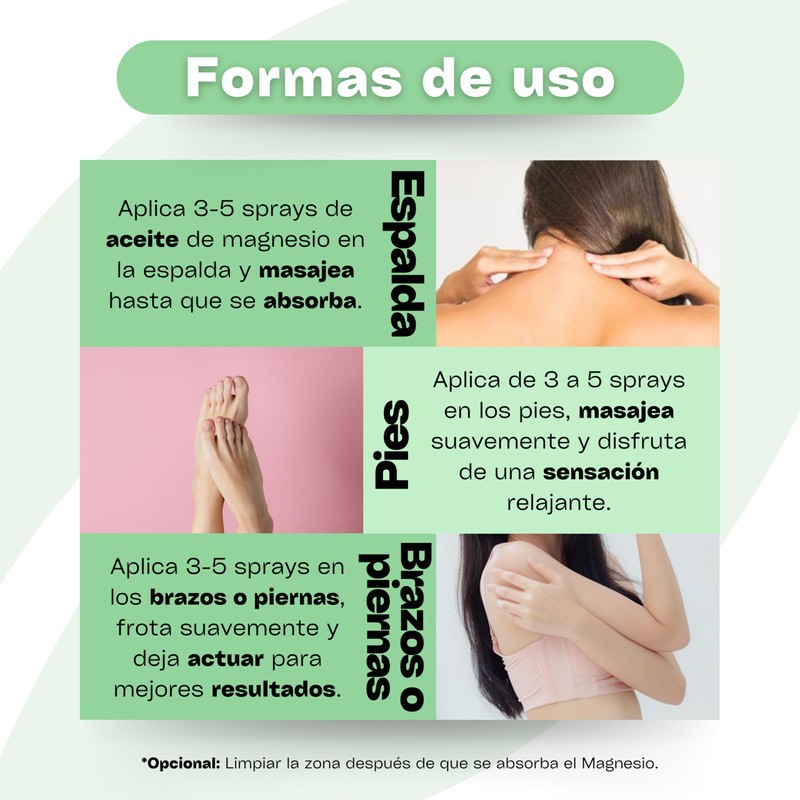 - Alta Concentración y Rápida Absorción: Nuestro aceite de magnesio penetra rápidamente en la piel, proporcionando una sensación no grasosa. Solo necesitas aplicar de 3 a 5 sprays en la zona deseada y masajear suavemente para su total absorción.
