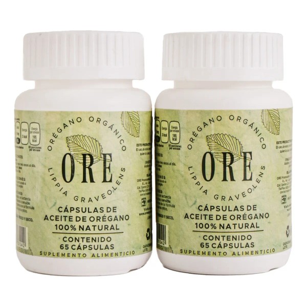 El Aceite de Orégano ORE en cápsulas es un suplemento natural altamente valorado por sus potentes propiedades antibacterianas, antivirales, antifúngicas y antioxidantes. Este kit incluye 2 frascos con 65 cápsulas cada uno, ideal para uso continuo o en familia.