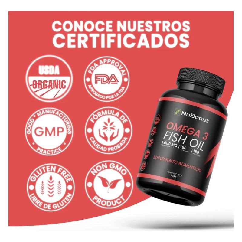 Aceite de Salmón Omega 3 de Nuboost, un suplemento de 1000 mg con EPA y DHA para apoyar la salud cardiovascular y cerebral. Su fórmula es pura y enriquecida con Vitamina E.