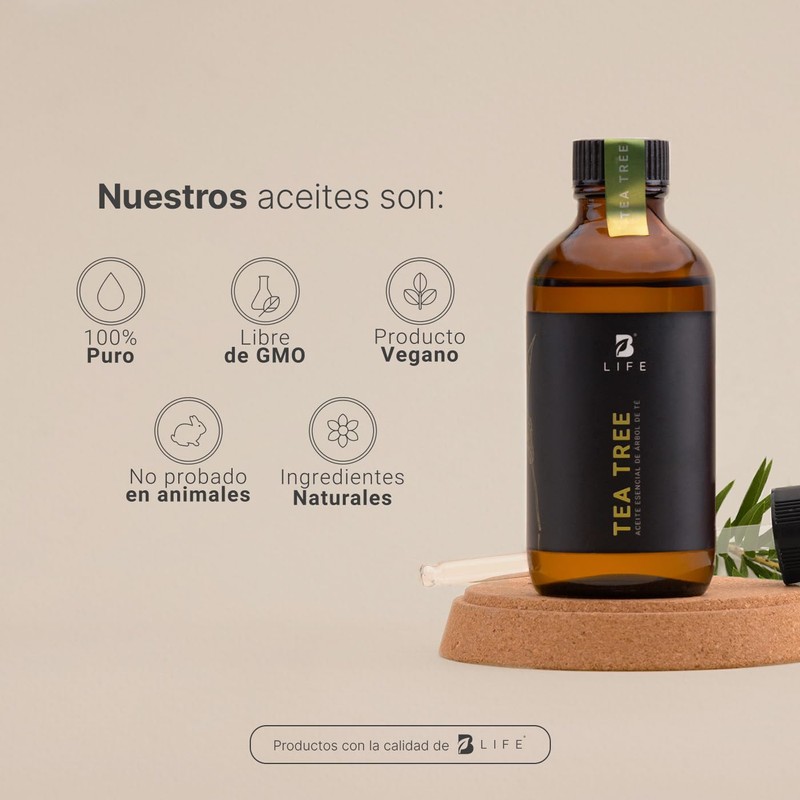 • ¡Eleva tus sentidos con Tea tree Essential Oil B Life! Descubre la maravilla de nuestro aceite esencial de té de árbol, 100% natural y lleno de beneficios derivados de esta esencia pura. Su exquisito aroma no solo armoniza tu espacio, sino que también te sumerge en un ambiente relajado y acogedor.