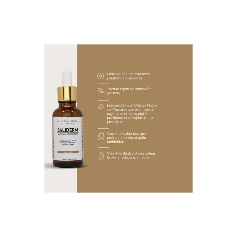 SALIDERM es un aceite facial ideal para realizar la extracción en cabina o en casa sin necesidad de utilizar vapor. Contiene ingredientes vasodilatadores que ayudan a abrir los poros, suavizan la grasa enquistada y facilitan la extracción de comedones, puntos negros y filamentos sebáceos.