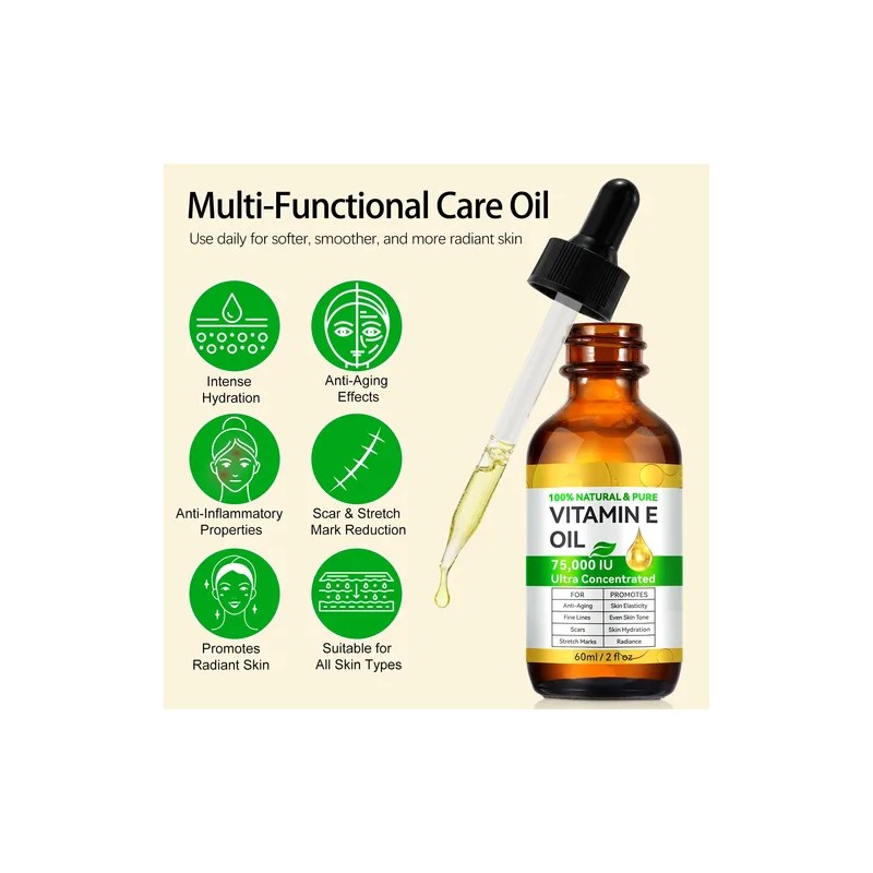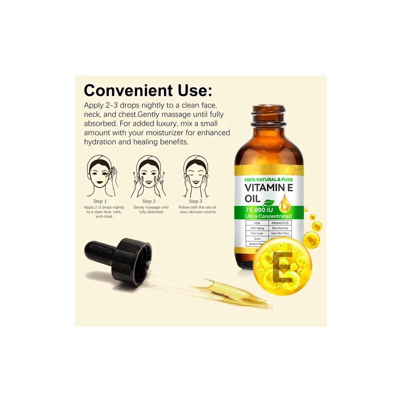 1. Aceite de vitamina E ultraconcentrado: fórmula multiusos. Aceite de vitamina E puro sin diluir con una concentración de 75.000 UI para una hidratación intensa. Úselo en rostro, cuerpo, cabello, uñas, raspando o masajeando. Prensado en frío, apto para veganos y libre de parabenos, sulfatos y fragancias sintéticas.