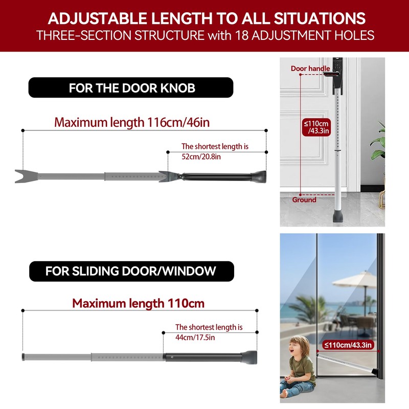 - [2-in-1 Door & Sliding Door Security Bar] Use our adjustable door security bar to deter burglars from breaking into your house, apartment, or even hotel room. The length of the door barricade security bar can be adjusted from 21 to 46inch, and the full product weighs only 2.2 pounds, making it easy to carry during travel or store at home.