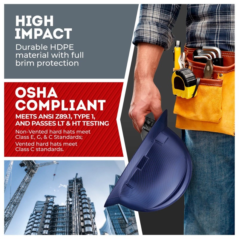 The Acerpal Hard Hat meets rigorous safety standards, including OSHA and ANSI Z89.1-2014 Type 1, Class E, G, and C, ensuring compliance with essential regulations. Its non-vented design offers optimal protection against electrical hazards, making it suitable for a wide range of industries.