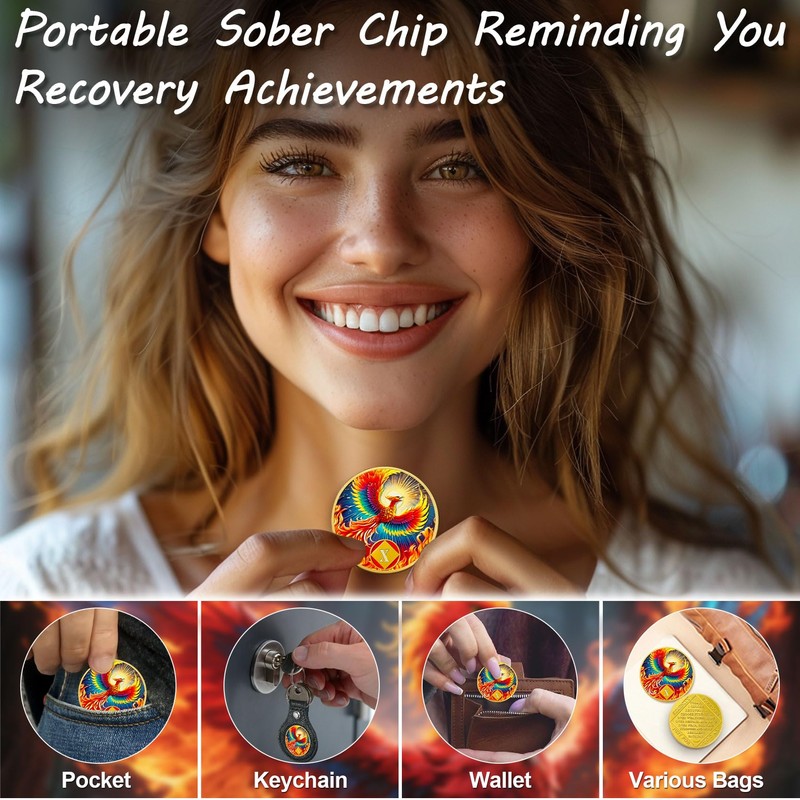 - Sobriety Chips Front Design: Features a phoenix rising from the flames, symbolizing how individuals can emerge from hardship, renewed with life and strength after experiencing pain and challenges. The vibrant, colorful wings and flames represent inner hope, freedom, and revival, highlighting the spiritual and emotional transformation one undergoes during the journey of sobriety