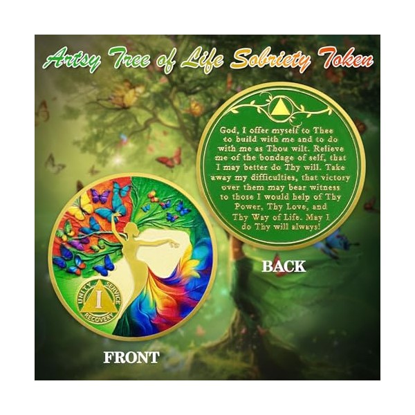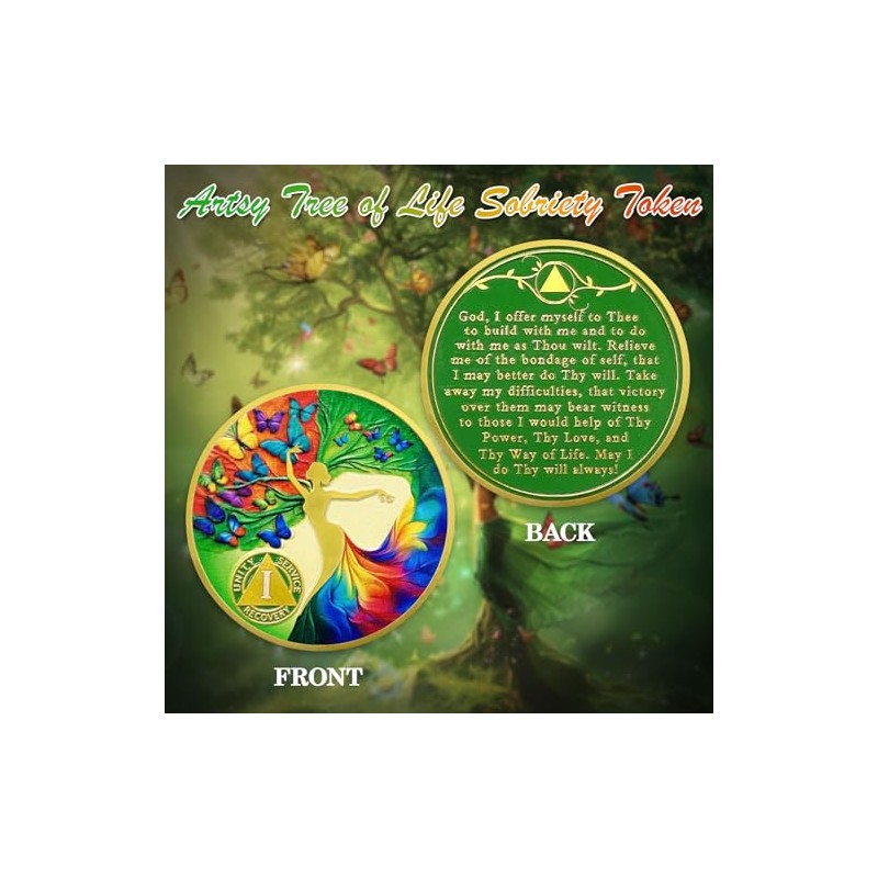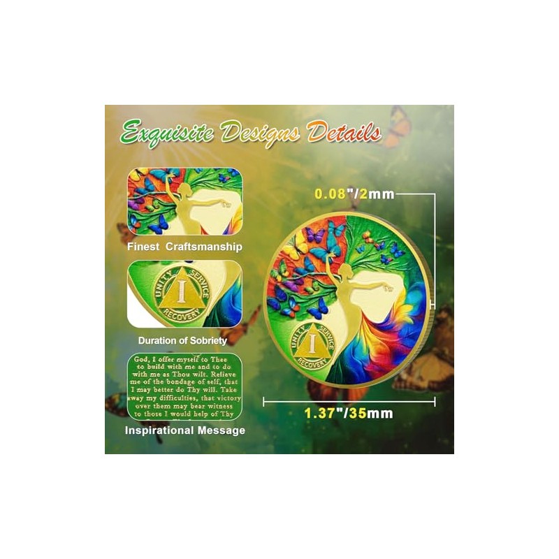 ACGZQY Sobriety Coin - Year Month Artsy Butterfly Tree of Life Sobriety Chip AA Coin and Medallions Sober Token Narcotics Alcoholics Anonymous Recovery GiftsProduct InformationAA chips and medals are a tangible reminder of progress and commitment to living a sober life. These chips can be powerful motivators for people in recovery.Sobriety Coin Size: Approx. 1.37 inches in diameter and 0.08 inches thick.AA coins made of gold plated iron with unique 3D craftsmanship.Each coin comes in a transparent and sturdy plastic case.Perfect for your pocket, wallet or as a keychain.Front of Sober chips: Depicts an artistic tree of life surrounded by colorful butterflies, symbolizing the journey of transformation, freedom, and rebirth in recovery. The AA triangle symbol with the words "Unity, Service, Recovery" reflects the core principles of Alcoholics Anonymous, emphasizing unity, helping others, and the process of self-recovery. It also marks the duration of sobrietyBack of Sobriety medallions: Engraved with a prayer: God, I offer myself to Theeto build with me and to do with me as Thou wilt. Relieve me of the bondage of self, that I may better do Thy will. Take away my difficulties, that victory over them may bear witness to those I would help of Thy Power, Thy Love, and Thy Way of Life. May I do Thy will always! Providing the holder with spiritual support and guidance, emphasizing inner peace and the wisdom of taking life one step at a timeMeaningful GiftsWhether as a sobriety anniversary gift, to celebrate a milestone, or to honor an AA sponsor, these sobriety medals are ideal. They are appreciated far beyond the AA community and make a thoughtful gift idea for anyone needing encouragement, celebrating progress in recovery, or seeking support during difficult times.