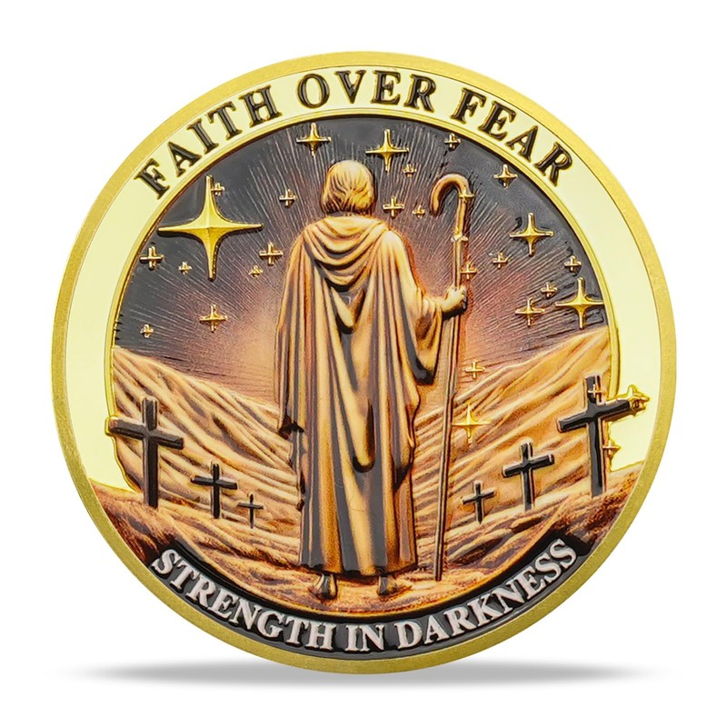 - Christian Challenge Coin Front: Shows Jesus with His back to the wearer, holding a shepherd's staff, walking along a rugged path, with a cross ahead and a starry night sky behind. The inscriptions "Faith Over Fear" and "Strength in Darkness" are featured. This symbolizes that, even in darkness and difficulty, faith provides us with strength and guidance. Reminding the holder to stand firm in faith and overcome fear, no matter how challenging the moment
