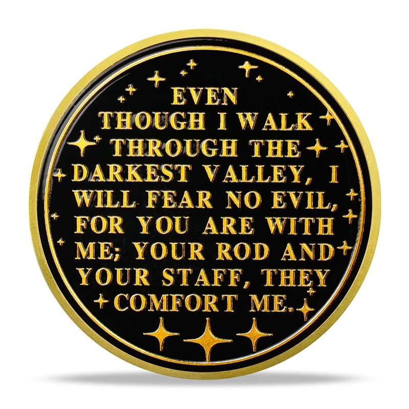 - Religious Coin Back: Engraved with the scripture: "Even though I walk through the darkest valley, I will fear no evil, for you are with me; your rod and your staff, they comfort me." This verse from Psalm 23:4 expresses that in the darkest times, faith and the presence of God bring comfort and strength, dispelling fear. Representing God's guidance and protection, reminding the wearer that, no matter the struggle, God is always with us, offering strength and comfort
