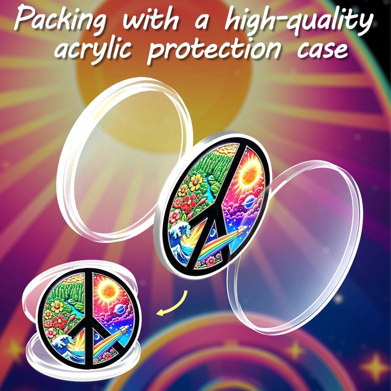 - PREMIUM MATERIAL & IDEAL SIZE This Peace and Love token is made of high quality materials and finished with exquisite 3D engraving. The coin has a diameter of approximately 40 mm and a thickness of 3 mm. It fits easily into pockets, wallets, key rings, coin displays or various pockets. Each coin comes with a high quality clear protective case that ensures safe storage and presentation