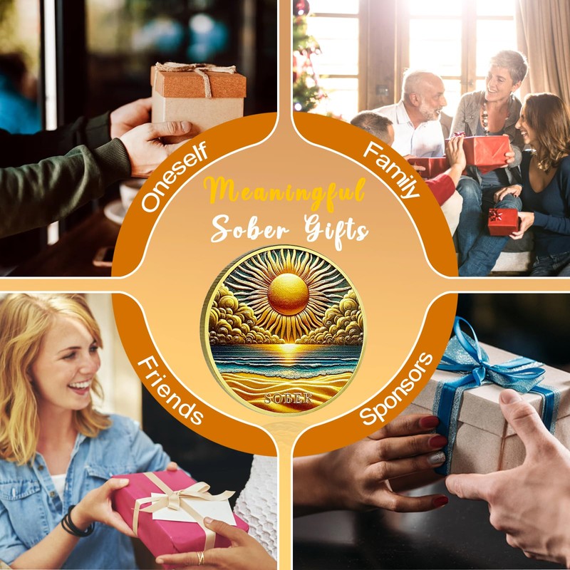 - Sunrise Serenity Token: This sober token features an artistic golden beach scene, with a radiant sun shining high in the sky. The calm ocean and sandy shore glisten under the sunlight, radiating warmth and comfort. This serene landscape symbolizes the journey of those in recovery—filled with hope and peace. It encourages individuals to find strength each day, maintain their faith through hardships, and embrace a brighter future