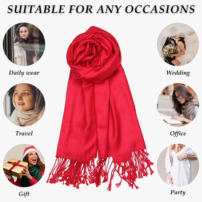 - Super soft and has a subtle sheen, drapes beautifully. Pashmina shawls and wraps come in handy for many reasons. They offer shoulder coverage and keep you warm on cool days. They're an easy way to accessorize your dress and change up your style with zero effort. They may become the most versatile piece in your wardrobe. Suitable for all seasons, events, and occasions.