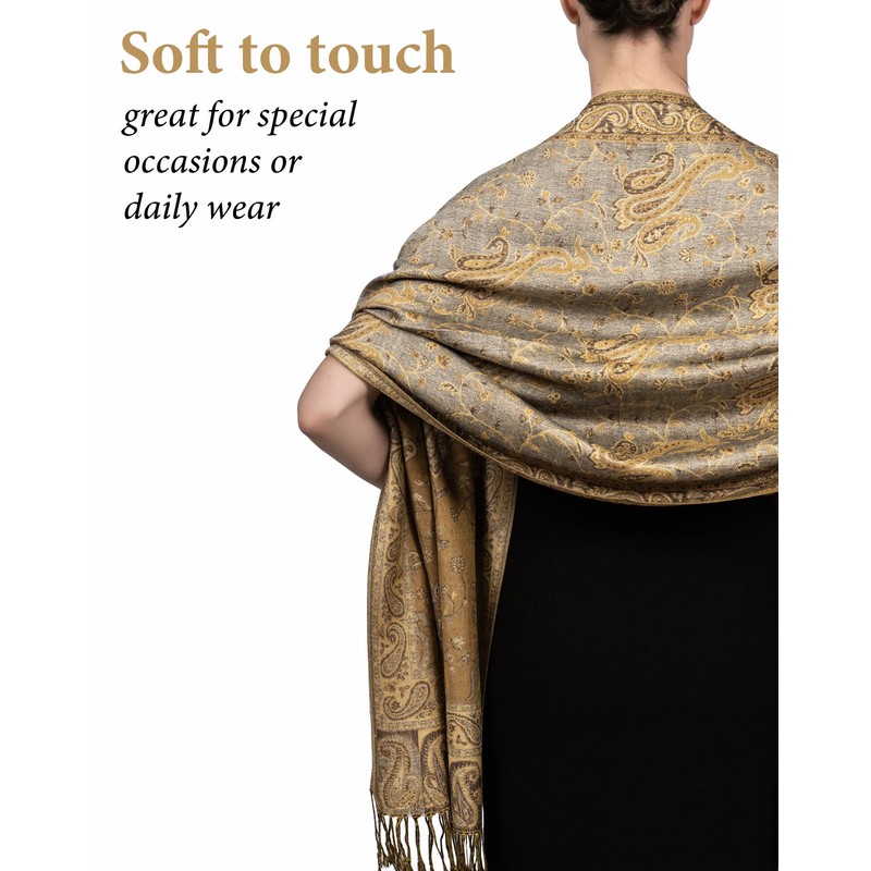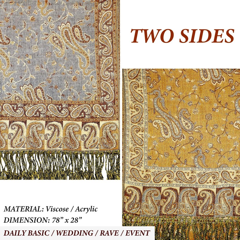 - FEATURES EXOTIC TAPESTRY DESIGN AND DOUBLE LAYERED FABRIC. This reversible paisley pashmina can also be used as a light blanket to bring with you on nature walks or hung above your bed like a wall accessory. This all-season shawl is a beautiful, versatile accessory to add to your wardrobe.