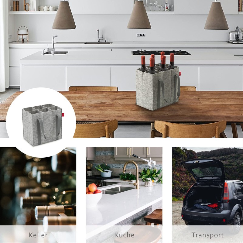 - Safe and compact: with the practical bottle basket, full bottles, but also empty, can be transported safely and orderly. The individual dividers ensure order in vehicles, cupboards, kitchen surfaces, etc. Thanks to the strong side walls made of thick felt, the empty bag always stays in its shape and there is no unwanted collapse.