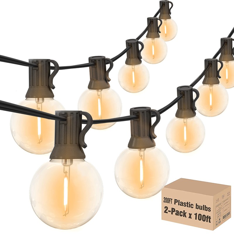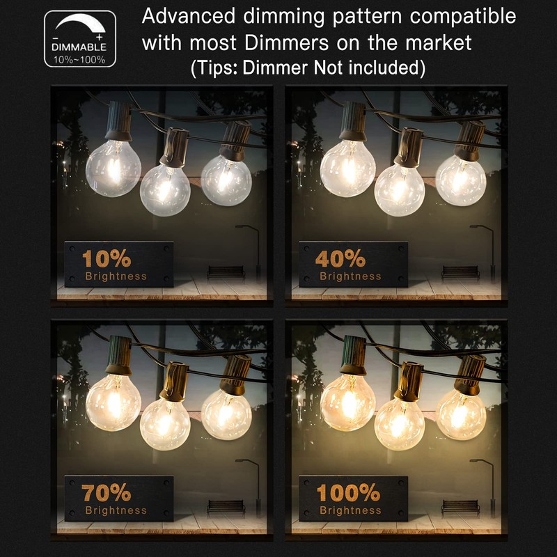 - ENERGY-SAVING DIMMABLE LED GLOBE STRING LIGHTS - G40 globe string lights is 200 feet long (2 pack of 100 feet), comes with 100 sockets and 104 Led g40 bulbs (4 spare). 0.5W energy saving Led bulbs use less energy to incandescent bulbs with longer 15,000 hours lifetime, save your money on expensive electricity bills. Also led globe lights string compatible with dimmers, you can change the atmosphere as you want by adjust the lighting (Tips: Dimmer not included in the set)