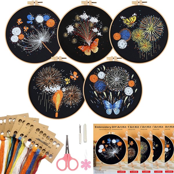Acidea 5 Sets Beginner Embroidery Kit for Adults, DIY Cross Stitch Kit with Firework Embroidery Patterns, Punch Needle Embroidery Kit, Hand Embroidery Kit