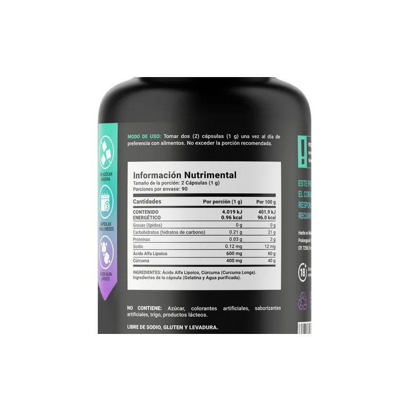 ¡Disfruta la formulación de Alpha Lipoic Acid B Life. Cada cápsula de 500 mg está diseñada para aportar una potente concentración de Ácido Alfa Lipoico, un valioso antioxidante. Además de estar enriquecida con Cúrcuma para potenciar sus beneficios, ingrediente valioso que otras fórmulas carecen. Contiene180cápsulas. Hasta 3 meses de consumo por envase. Ingiriendo ingredientes naturales de la más alta calidad. Consumir 2 cápsulas al día (1 g) preferiblemente con alimentos (dosis sugerida). Este producto no es un medicamento, su consumo es responsabilidad de quien lo recomienda y usa. Aviso legal • Edad mínima recomendada: 18 años. • Este producto es un suplemento dietario, no es un medicamento. Suplementa dietas insuficientes. Consulte a su médico y/o farmacéutico.