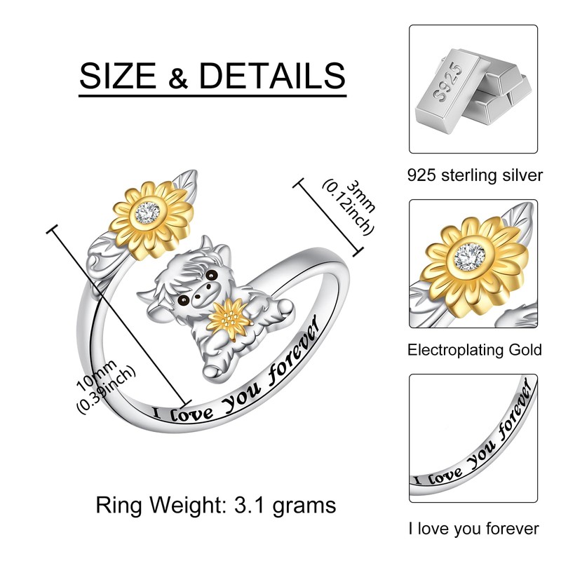 - Design: The silver ring symbolizes inner resilience (represented by the highland cow) and outward joy and optimism (represented by the sunflower)