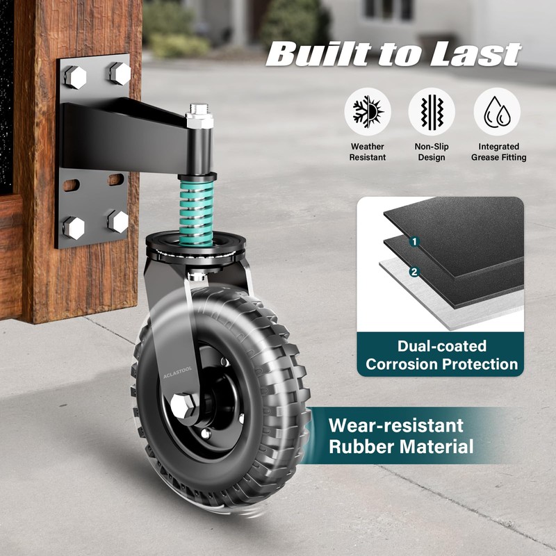 - Built Tough, Moves Effortlessly: Engineered with premium double ball bearings and a 5.6mm reinforced steel bracket, our spring loaded gate wheel delivers smooth 360° rotation and exceptional durability. The shock-absorbing spring maintains stability across various terrains.