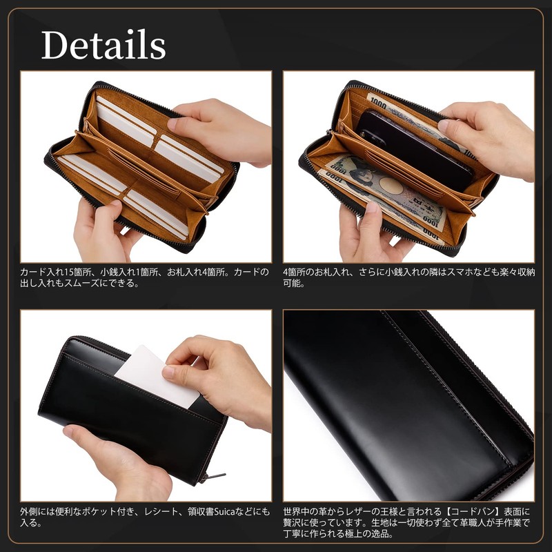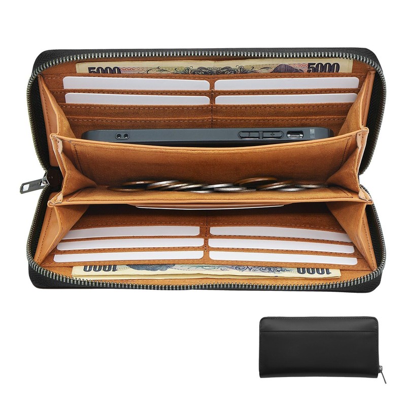 ACLUO Men's Long Wallet, Cowhide Leather, YKK Zipper, Coin Purse, Large Capacity, Black