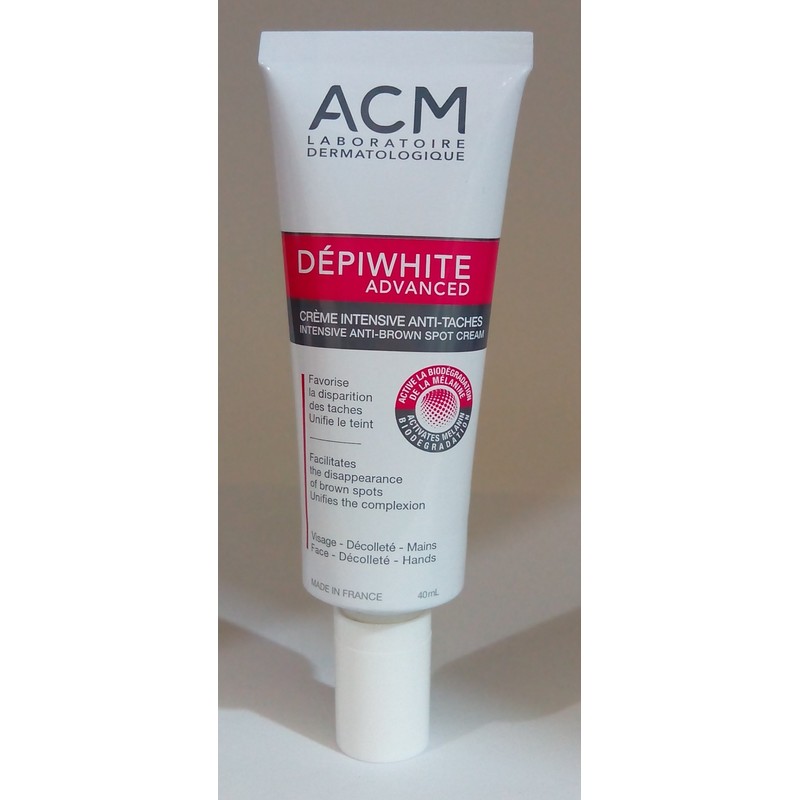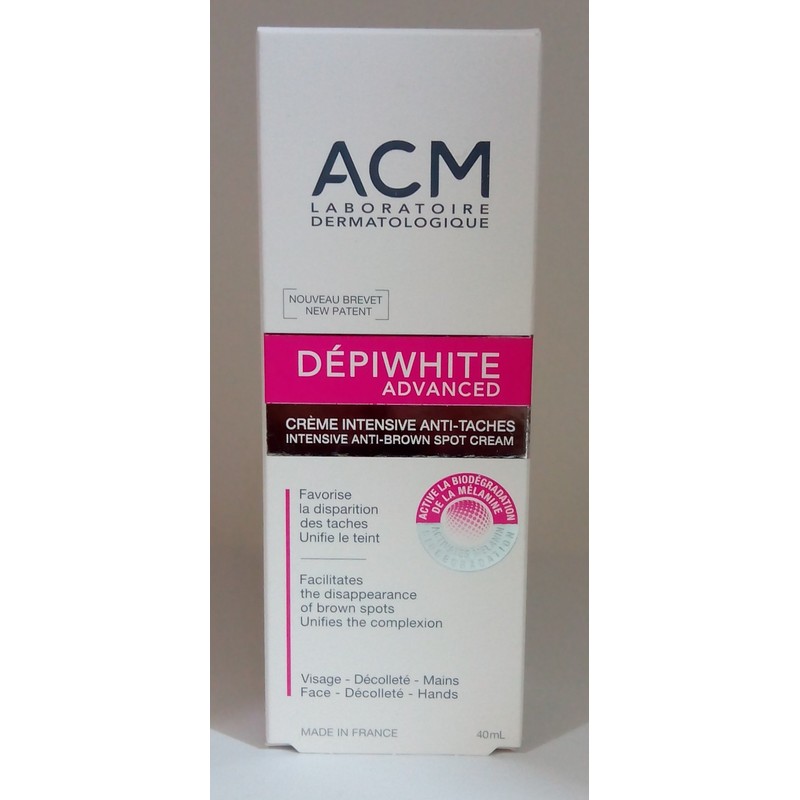 DEPIWHITE ADVANCED INTENSIVE ANTI-BROWN SPOT CREAM THIS CREAM PROMOTES THE DISAPPEARANCE OF BROWN SPOTS SUCH AS CHLOASMA AND LIVER SPOTS. Thanks to its combination of specific active substances, Depiwhite Advanced attenuates or eliminates brown spots, limits their reappearance and unifies the complexion by regulating the production of brown spot-forming melanin thanks to 3 synergistic actions: Reduction of melanin production Elimination of existing epidermal melanin Stimulation of melanin biodegradation ACM patent 1st melanin biodegradation activator A combination of active substances capable of acting at all stages of melanogenesis Unifies skin tone INSTRUCTIONS FOR USE Apply the intensive anti-brown spot cream once per day, only to the concerned areas of the neck, face or dcollet and only to small areas, for 2 to 6 months.