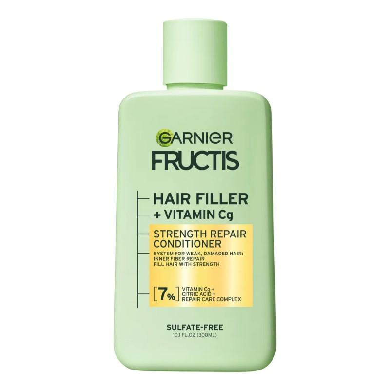 Acondicionador reparador Garnier Fructis Hair Filler con vitamina CG, acondicionador sin sulfatos para cabello débil y dañado, 10,1 onzas líquidas, 1 unidad, acondicionador para cabello dañado: nuestro acondicionador para cabello débil y dañado con vitamina CG, ácido cítrico y complejo de cuidado reparador, llena el cabello con 7 capas de profundidad para reparar la fibra interna y la transformación exterior visible, sistema de reparación: vea un cabello hasta 4 veces más fuerte con hasta un 79 por ciento menos rotura con el uso de champú, acondicionador y tratamiento reparador de fibras internas y tratamiento reparador de fuerza, Champú con sérum frente a champú sin acondicionador. Sistema de relleno capilar en 4 pasos: aplica el tratamiento previo al champú Bonding Inner Fiber Repair y déjalo actuar durante 5 minutos. Enjuaga y aplica el champú Strength Repair. Enjuaga y aplica el acondicionador sobre el cabello mojado. Aplica el sérum reparador Strength. No lo enjuagues: Garnier apuesta por una belleza más ecológica: este acondicionador para el cabello ha sido formulado sin sulfatos, parabenos, ftalatos, hidantoína DMDM ni aceite mineral. Certificado por Leaping Bunny, libre de crueldad animal y con una fórmula vegana, sin ingredientes de origen animal. Garnier ofrece una variedad de productos para tus necesidades de cuidado del cabello y la piel, desde champús, productos para el cuidado del color y el peinado hasta fórmulas que limpian, hidratan y ayudan a proteger la piel