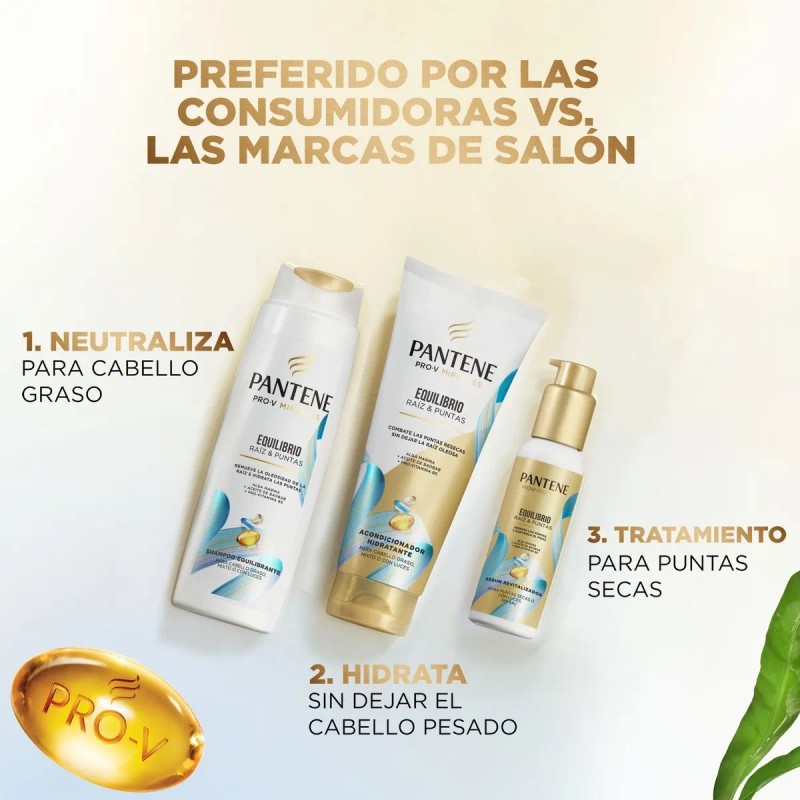 El acondicionador para cabello mixto y/o teñido de Pantene Equilibrio Raíz y Puntas penetra las puntas secas y maltratadas, dejándolas ligeras, hidratadas y sin frizz; contiene glicerina, que facilita el enjuague y lo deja deja suave y brillante.