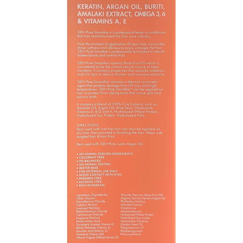 💆♀️ Revitaliza tu cabello con el poder de la naturaleza: el acondicionador sin enjuague Rev320 320 Pure Smoothie está formulado con extractos 100% puros, como aceite de amalaki, aloe vera, manzanilla y vitaminas E, B12 y A. Su fórmula ligera y libre de parabenos, sulfatos y alcohol hidrata profundamente, controla el frizz y deja el cabello suave, brillante y manejable. Ideal para todo tipo de cabello, especialmente el fino o dañado.