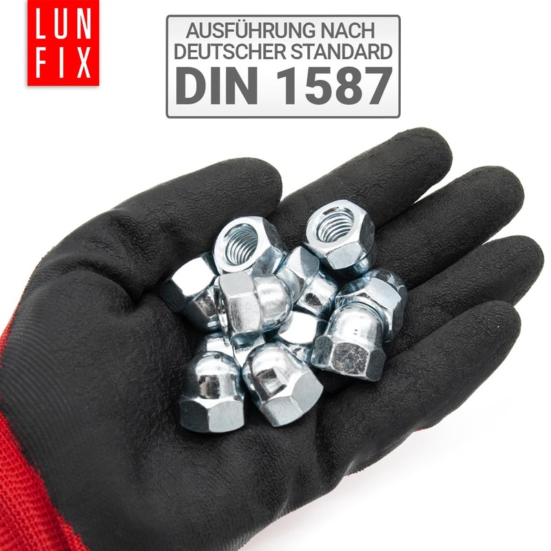 - The cap nuts from LUN FIX DIN 1587 are high hexagonal cap nuts with a metric internal thread. An important feature of the cap nuts is their shape, which prevents moisture and impurities from entering the threaded connection.
