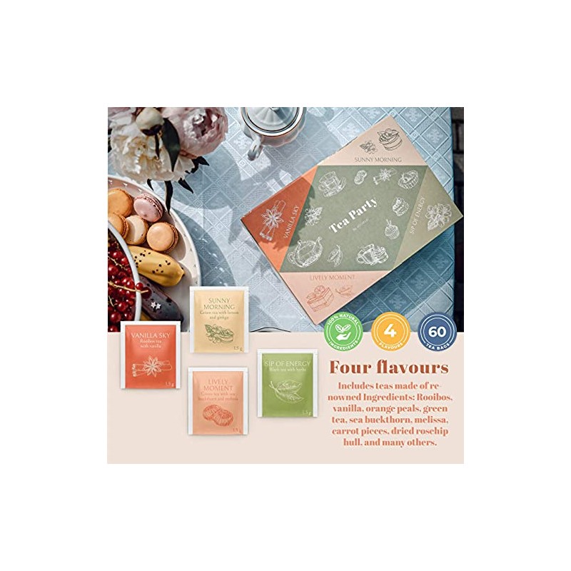 - TEA PARTY TEA SET- FOR AFTERNOON GATHERING OF FRIENDS AND FAMILY. Our gourmet teas uphold the highest EU quality standards. The latest technology used in the manufacturing process allows us to prevent usage of metal and glue in the tea bag production. Which results in a wonderful cup of tea, where the full spectrum of flavor and aroma pallet can be felt.