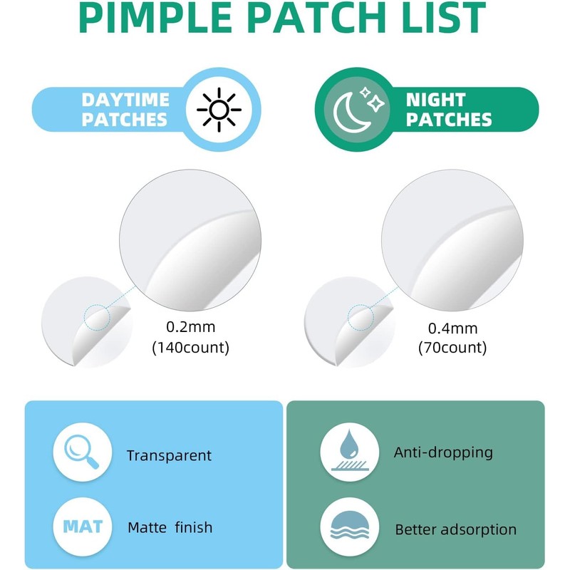- Invisible protection for day and night better adsorption: The two versions vary in thickness and transparency, 0.25 mm acne plasters that provide extra secure adhesion and provide a clear, matte finish that blends into all skin tones. 0.4mm acne patches at night for better adsorption effect and smooth acne, no falling off overnight, even a whole night.