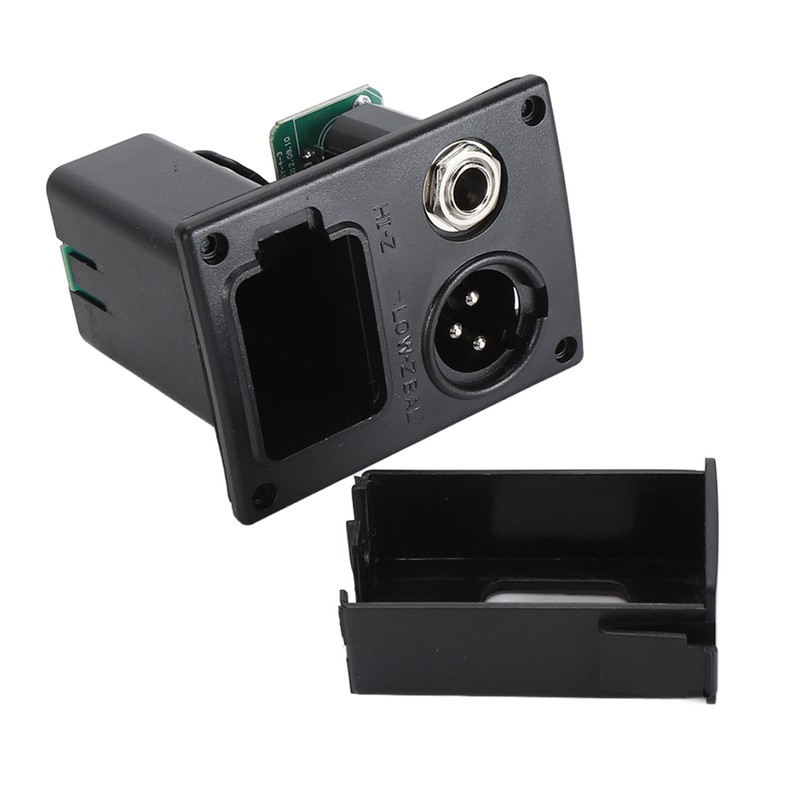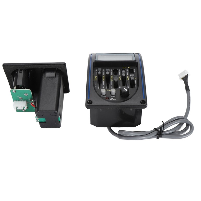 1、Guitar Pickup: Provides outstanding sound and pickup range, can be installed in any standard acoustic guitar body. Equipped with tuning function. 2、5 Band EQ System: 5 band EQ equalizer adjusts frequencies with Push BASS, MIDD, TREB, PRES, BLEND. Includes volume control, power on off button. 3、Accurate Control: 5 band equalizer allows you to accurately determine the location and obtain the correct sound. Real loudness control function. 4、Easy Assembly: Pre wired, includes 2.5mm plug in cable. Battery compartment with built in 6F22 9V battery holder (battery not included in delivery). 5、Professional Tuning: Suitable for guitars and basses. Catches vibrations from guitar bridge through piezo strip pickup, driven by 9V power supply.