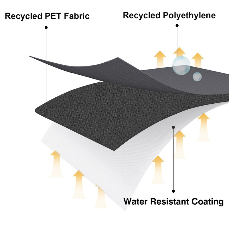 - Eco-Friendly Frabric: RPET Fabricas with PE coating, using about 45pcs PET battles;Cutting carbon dioxide emissions about 2.85kg ;Saving water about 4.22kg.