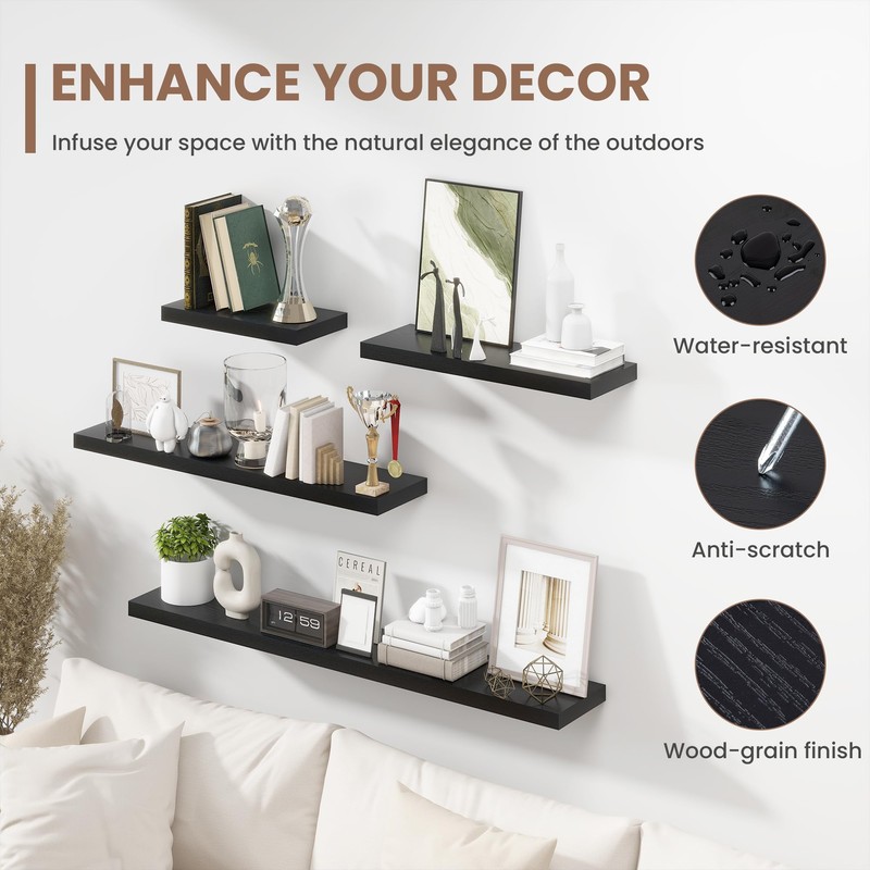 - [STABLE & SECURE INSTALLATION]: Equipped with a robust, hidden mounting bracket, these 24 inche floating shelves provide solid support for your items. Designed for easy, secure installation, they include all necessary hardware for a firm, wobble-free setup, so you can confidently display decor, photos, or functional items with style.